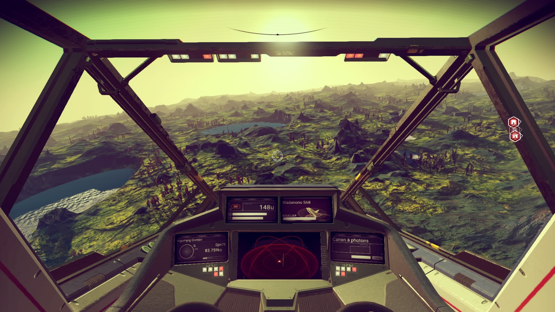 Un petit coup d’accélération et la carlingue de l’appareil quitte le sol, j’en profite pour faire un petit vol atmosphérique pour bien prendre en main les commandes. De ce côté-là, aucun souci le vaisseau répond au doigt et à l’œil mais impossible de faire du rase-motte. Le vaisseau suit la courbe du terrain à bonne altitude, il est donc impossible d’entrer en collision avec le relief.