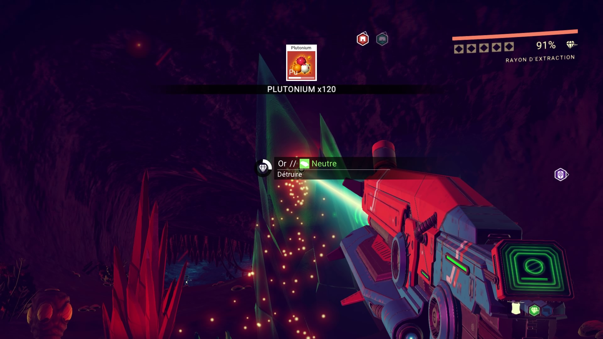 Je prends mon multi-outil et c’est parti pour le minage, un coup de scan pour repérer les ressources et zouuu, je dégomme le décor : les plantes, les roches, les bestioles, tout y passe ! Je fais le plein de matières : Fer, Zinc, Cuivre et tous leurs copains de la table périodique. Ça va nous faire un bon rattrapage des cours de physique tiens !
