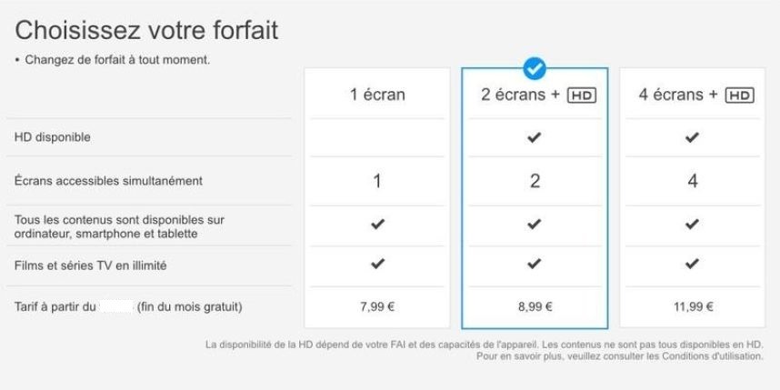 Pour la tarification, vous payez donc au mois mais également au nombre d’écrans que vous souhaitez pouvoir utiliser en même temps pour regarder les médias :