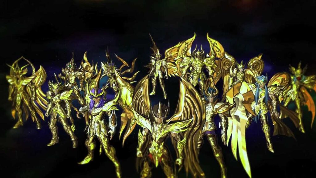 - Les Chevaliers d’Or dans leurs amures d’or et leurs armures divines : Mü, Kanon et Sorento