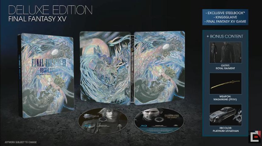 - la version Blu-Ray de Kingsglaive et du contenu exclusif : une tenue (Royal Raiment), une arme (Masamune) et une skin pour la voiture (Platinium Leviathan)