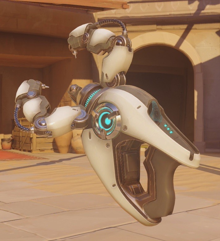 L’arme de Symmetra émet un rayon à courte portée qui se focalise sur un ennemi proche, lui infligeant des dégâts continus qui augmentent sur la durée. Le projecteur peut aussi envoyer une boule d’énergie surchargée qui inflige des dégâts importants.