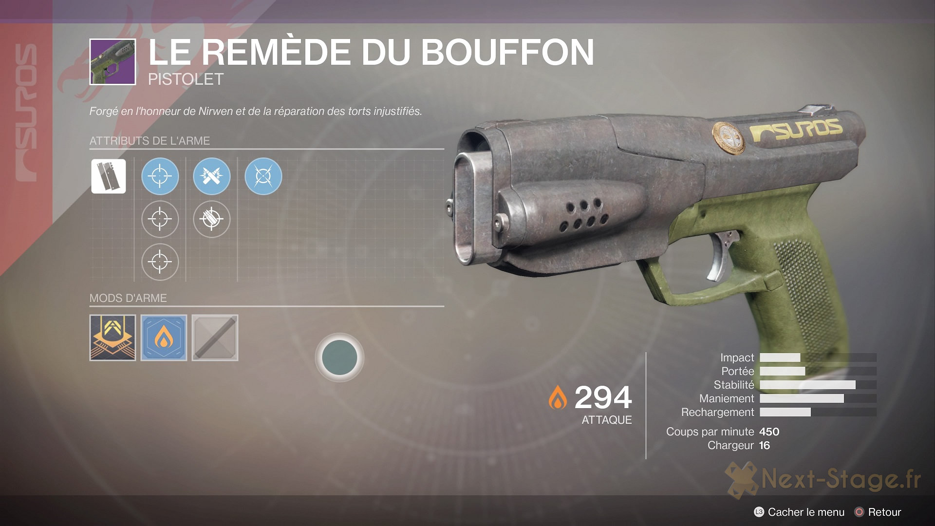 - Tir rapide SUROS : Tir automatique. La réserve de munitions est plus grande. Le rechargement est légèrement plus rapide quand le chargeur est vide.