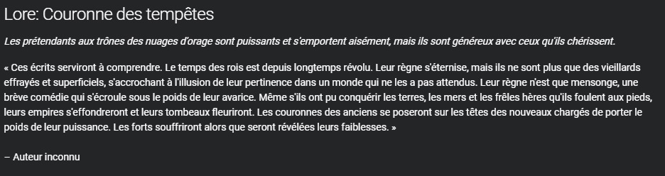 COURONNE DES TEMPÊTES : perks, lore, ornements.