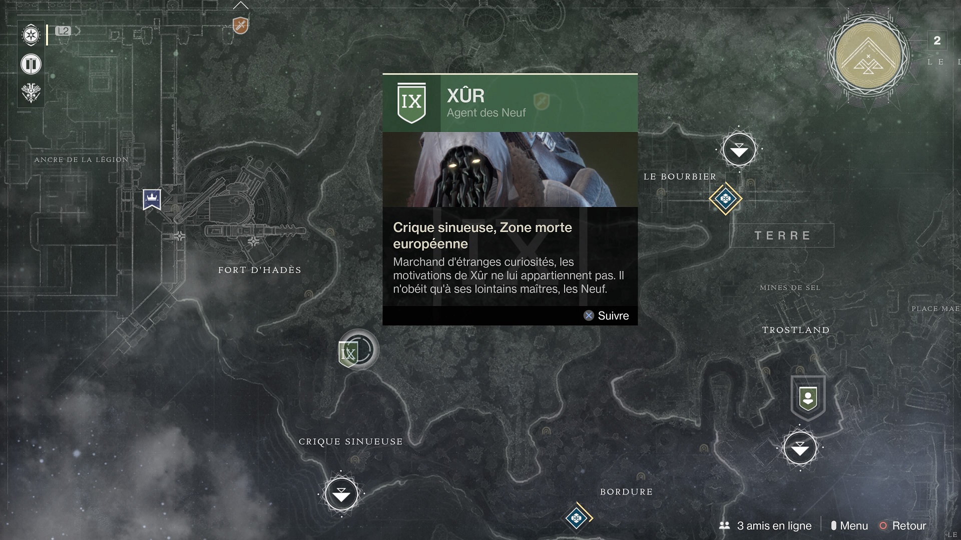 Notez que depuis le patch 2.0.0, l’icône de Xûr n’apparaît plus sur la carte et sa position n’est plus forcement lié à celle de la Poudrière.
