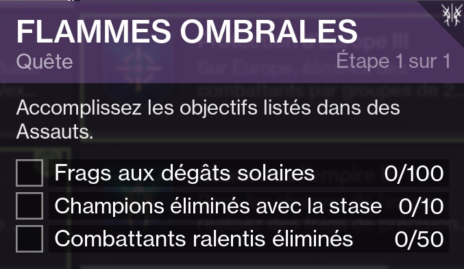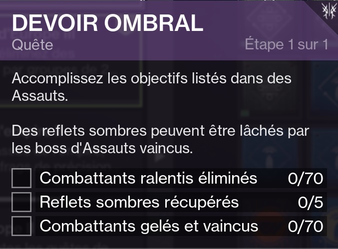 Une fois que c’est fait, elle vous offrira chaque semaine 2 quêtes de Fragments à réaliser, au choix, en Assaut, au Gambit et à l’Épreuve :