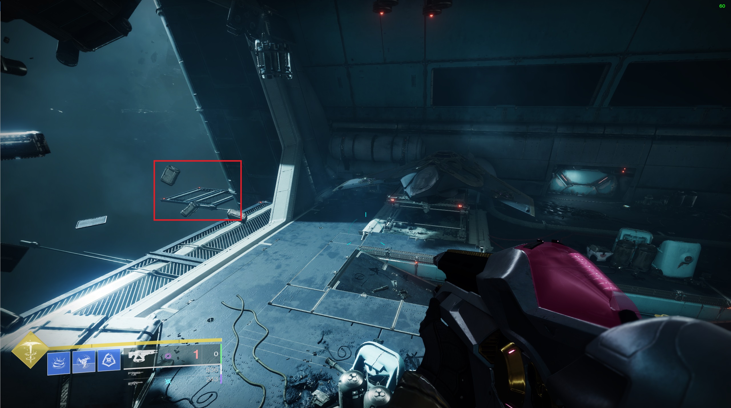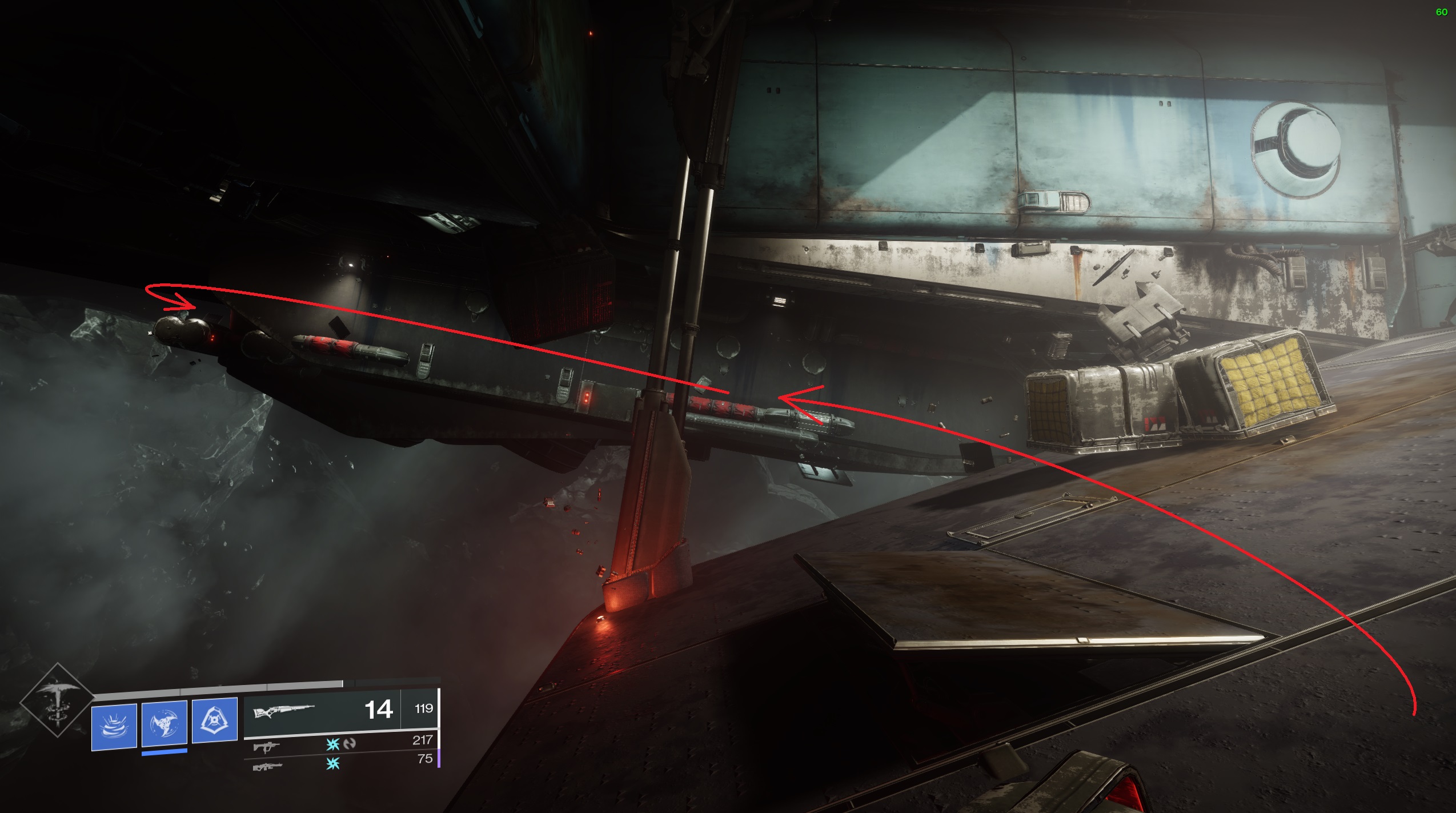 Une fois que vous avez fait le ménage, progressez à l’aide d’une plateforme à l’extérieur du hangar. Passez ensuite sur le vaisseau pour entrer dans un conduit en hauteur.