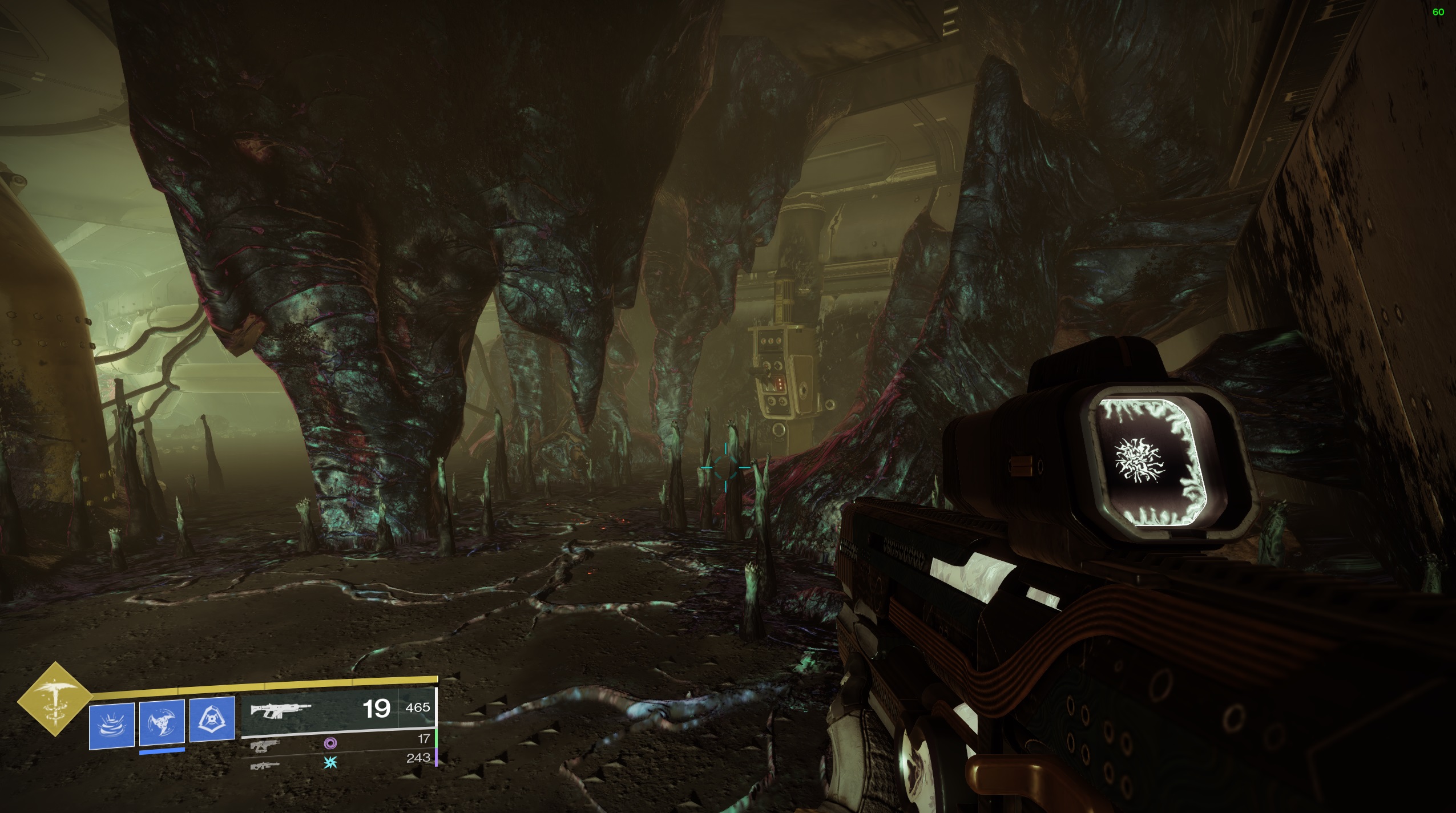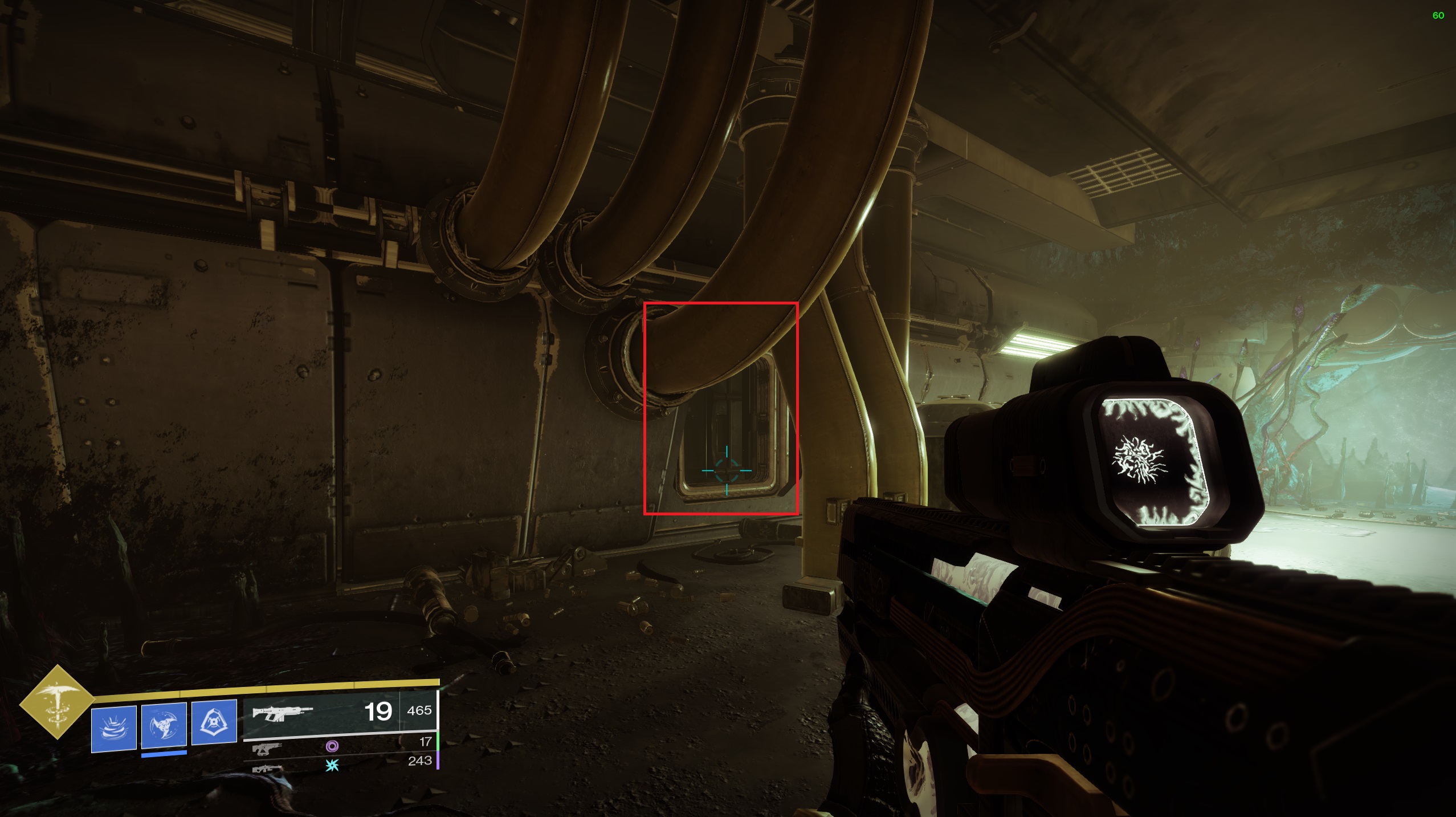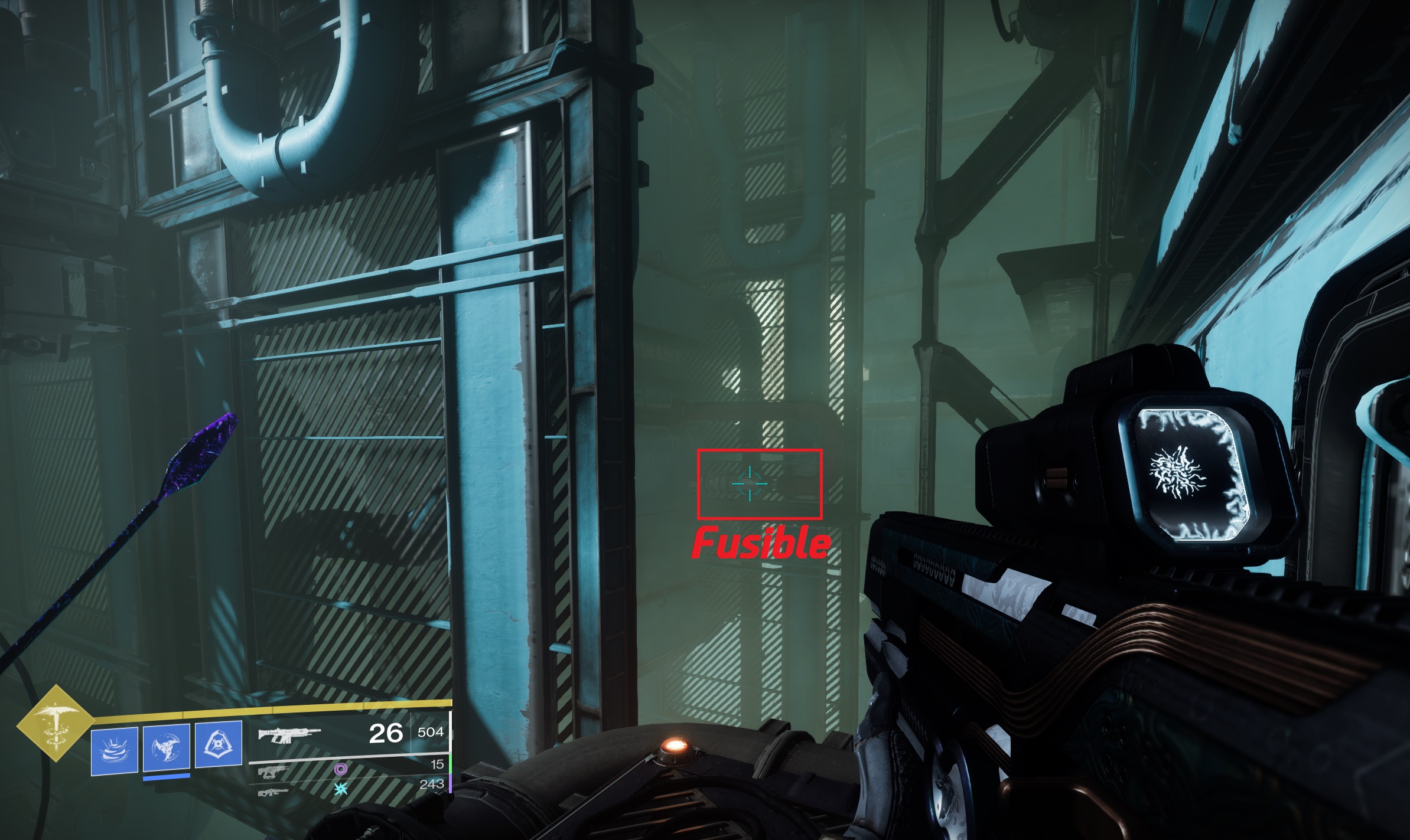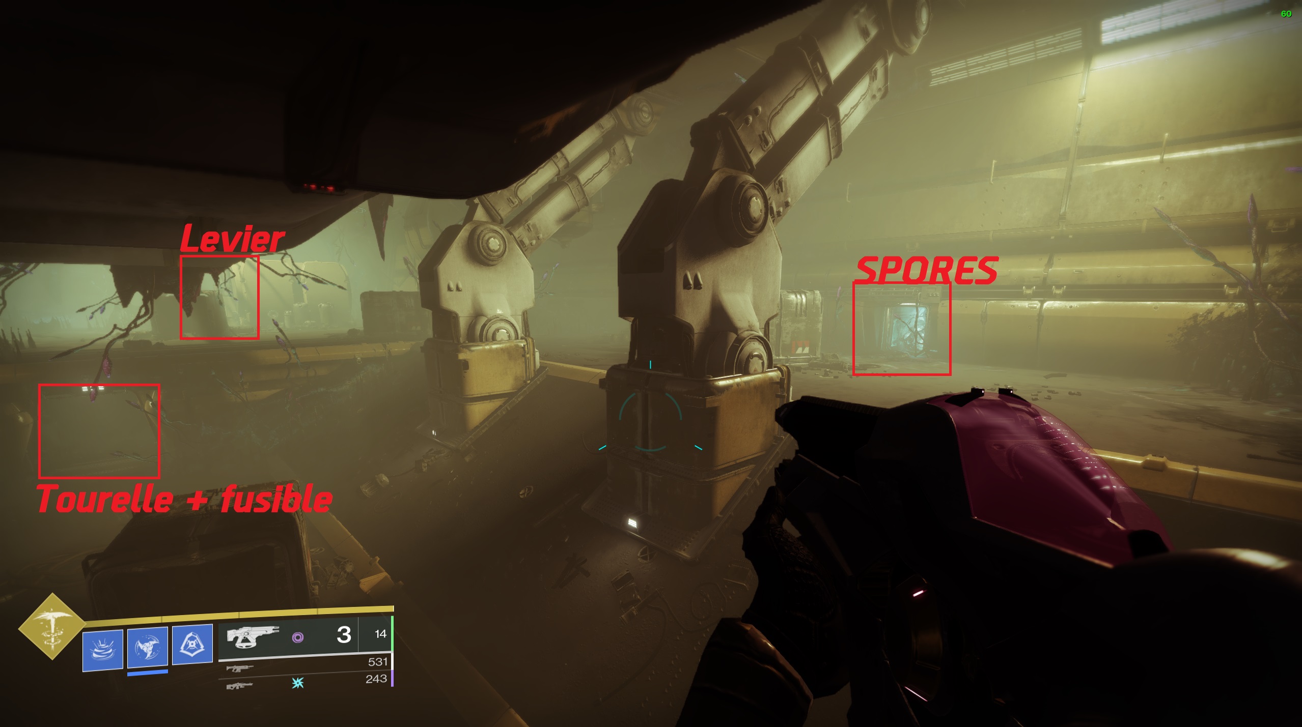 Pour la prochaine salle, activez d’abord le levier, détruisez la tourelle, détruisez le fusible, prenez le « Lien d’égrégore » et traversez la barrière de spore au sol :