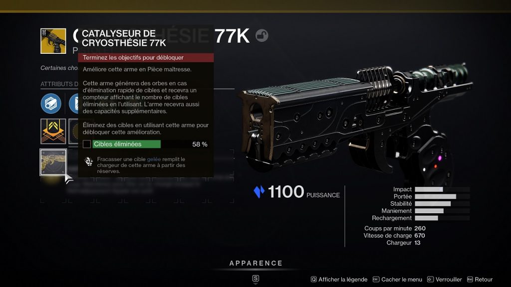 La solution ? Relativement simple : équipez l’arme et emparez-vous d’une arme énergétique quelconque puis effectuez des frags. Il n’y à plus qu’à faire vos 700 frags et le catalyseur sera à vous.