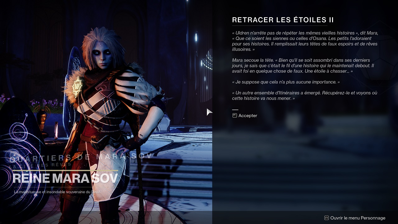 Nouvelle semaine, nouvelle étape dans la quête Retracer les Étoiles. Il n’est cette fois-ci pas nécessaire de progresser dans la quête saisonnière « Voyage du Chemineur« , rendez-vous simplement à la Boussole au C.I.M.U. Là vous pourrez prendre possession de la quête qui vous demandera d’aller voir Mara Sov.