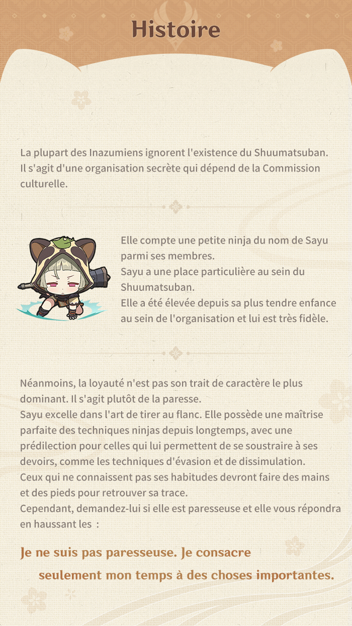 Histoire et aptitudes de Sayu