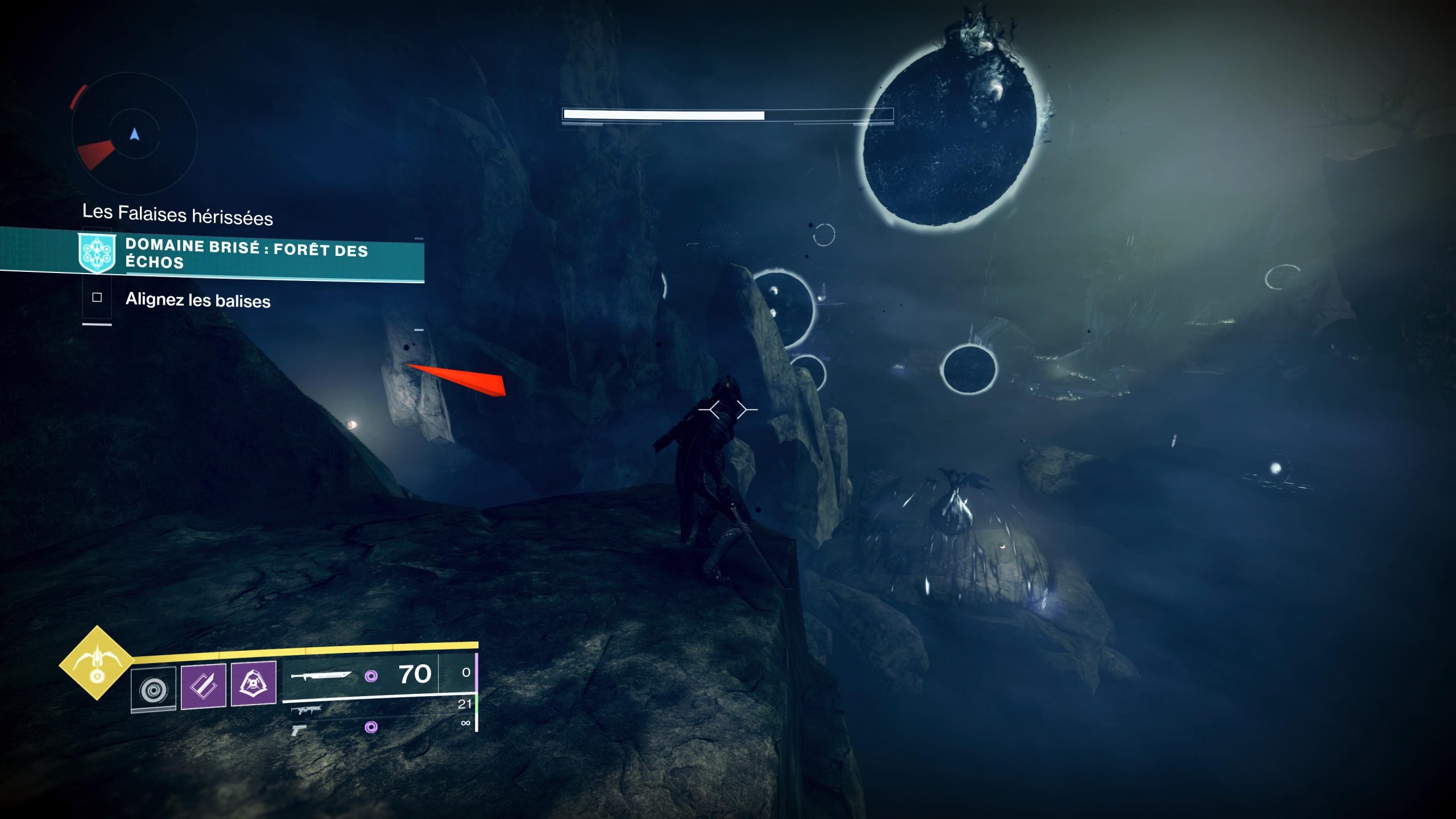 • Descendre en vision pure et sauter jusqu’à la balise de barrière que vous voyez sur l’image (c’est le moyen le plus simple et rapide)