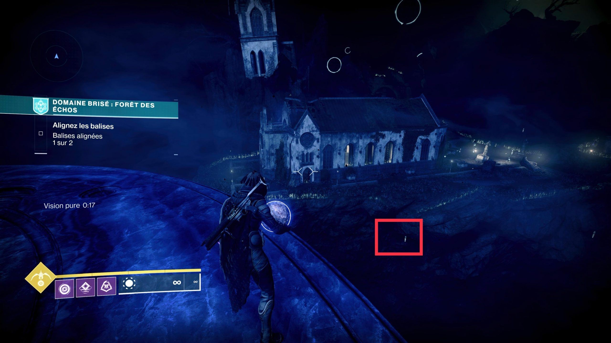 • Descendez vers la première balise dans la cathédrale (Activez là). Un peu avant en descendant vous trouverez sur votre gauche une balise de vison pure qui vous mènera à la plateforme en haut à gauche où trône une grande statue.