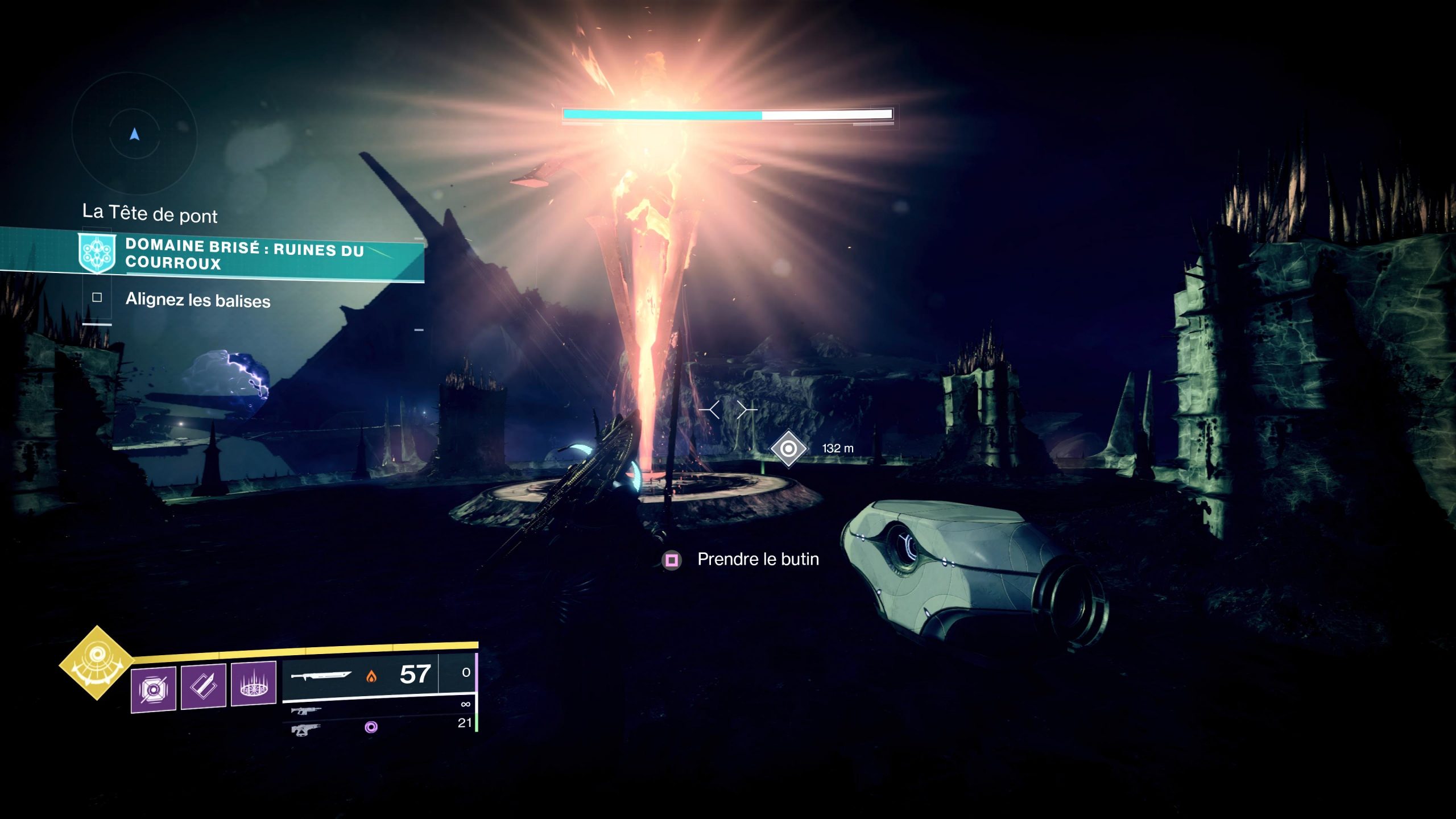 - Vous serez constamment en champ conflictuel ce qui limitera vos sauts et votre sprint. Avancez en tuant tout ce qui bouge et prenez la balise pour supprimer le champ et sautez sur la plateforme du boss. Tuez le et récupérez le coffre final.