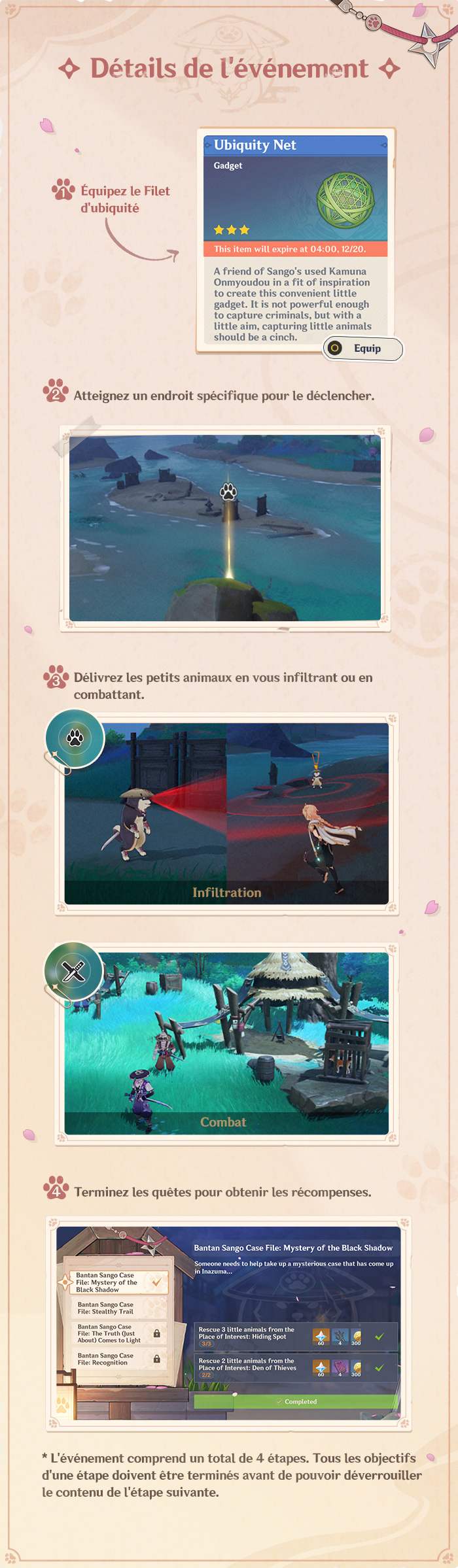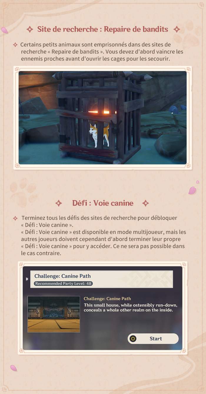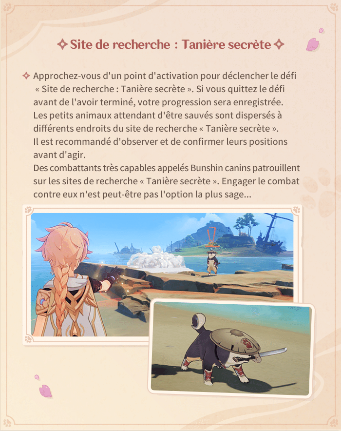 MiHoYo nous donne des détails sur le prochain évènement de Genshin Impact« L’affaire du Bantan Sango : Le chien guerrier » . Afin d’aider l’Agence de détectives Bantan Sango à mener à bien son enquête sur les disparitions massives de petits animaux, suivez vos directives de mission et sauvez les animaux dans les sites de recherche désignés.