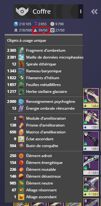 Parmi toutes les ressources déjà présentes, les nouvelles liées à l’Enclave ont été ajoutées dans l’app’. Il suffit simplement de mettre votre curseur sur le logo des ressources, situé en-dessous de l’onglet « coffre ».