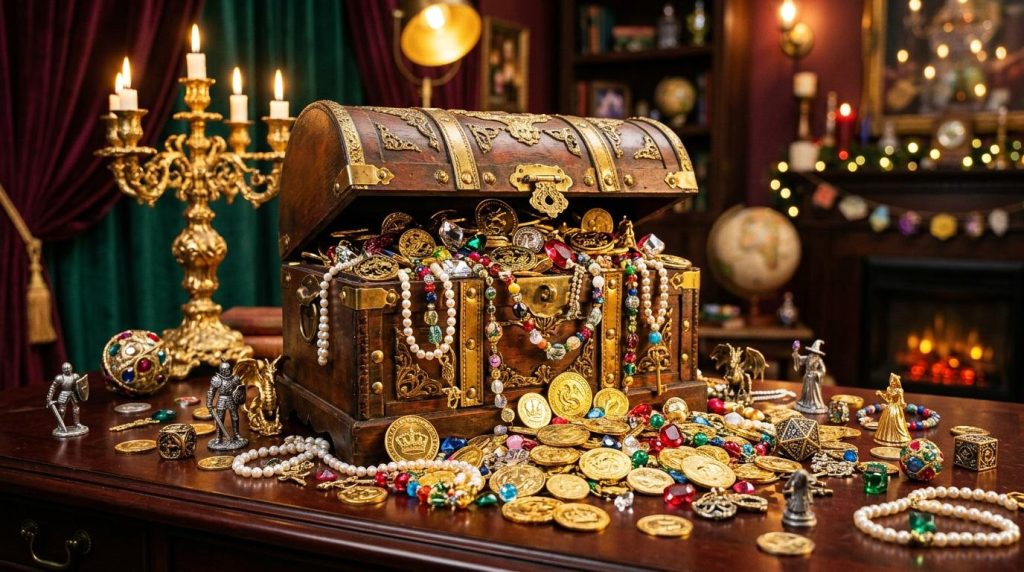 Coffre ouvert rempli de pièces d'or, bijoux et perles