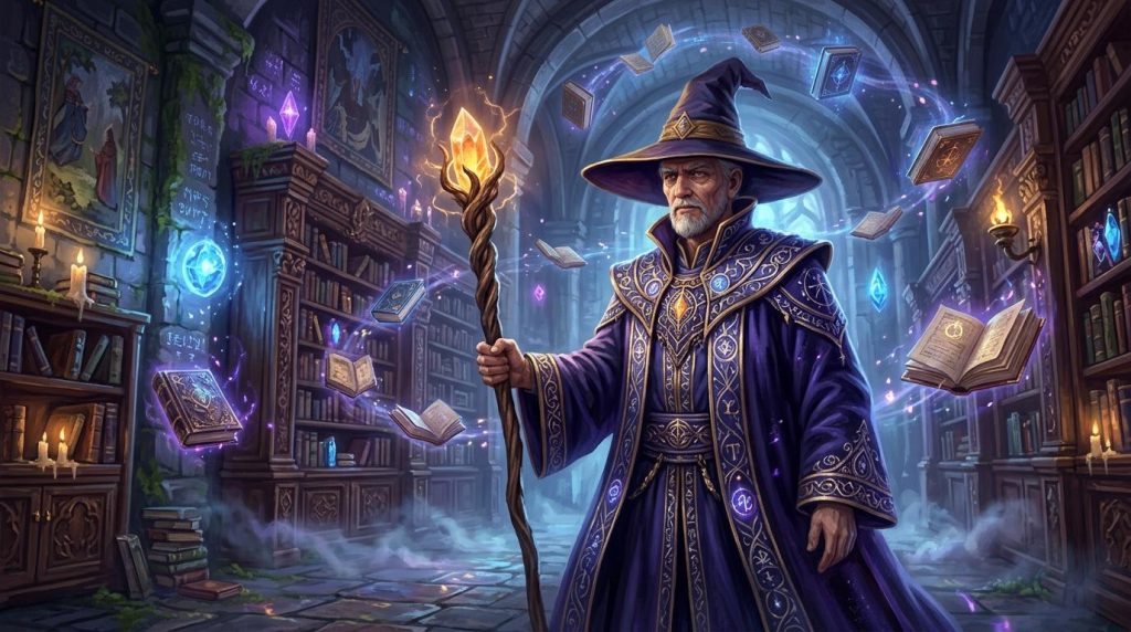 Magicien barbu avec bâton lumineux dans une bibliothèque magique