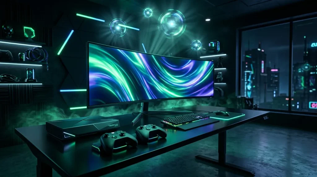 Bureau gamer high-tech avec écran incurvé et contrôleurs