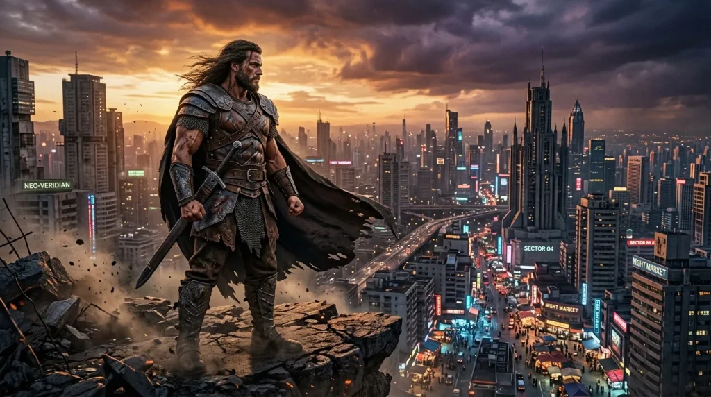 Guerrier armé dominant une ville cyberpunk au coucher soleil